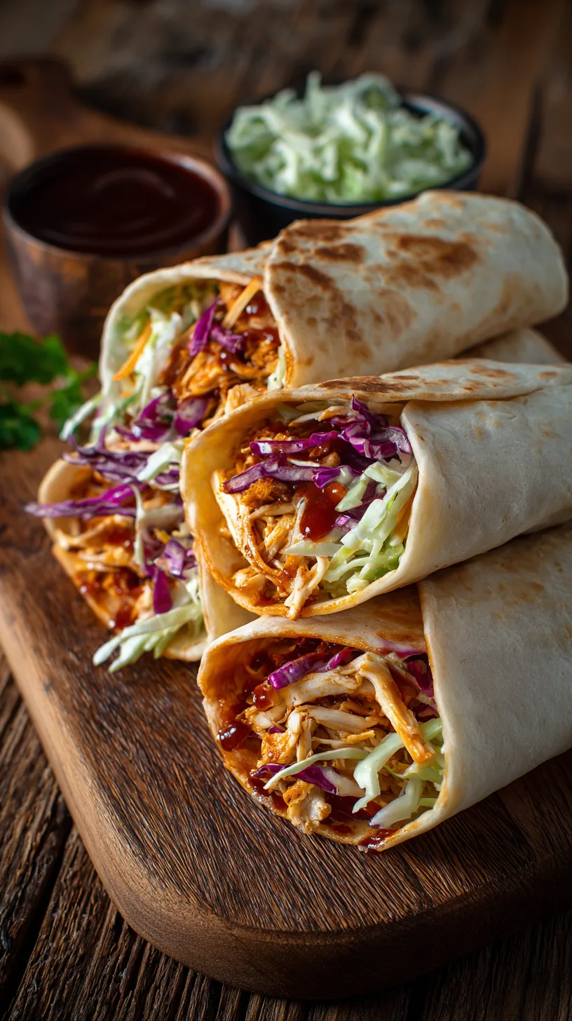 Warm tortillas in a dry skillet for 30 seconds per side. Place sliced BBQ chicken down the center, top with a generous portion of coleslaw, and add any optional toppings. Roll tightly, tucking in the sides as you go. Cut in half diagonally for the perfect presentation.