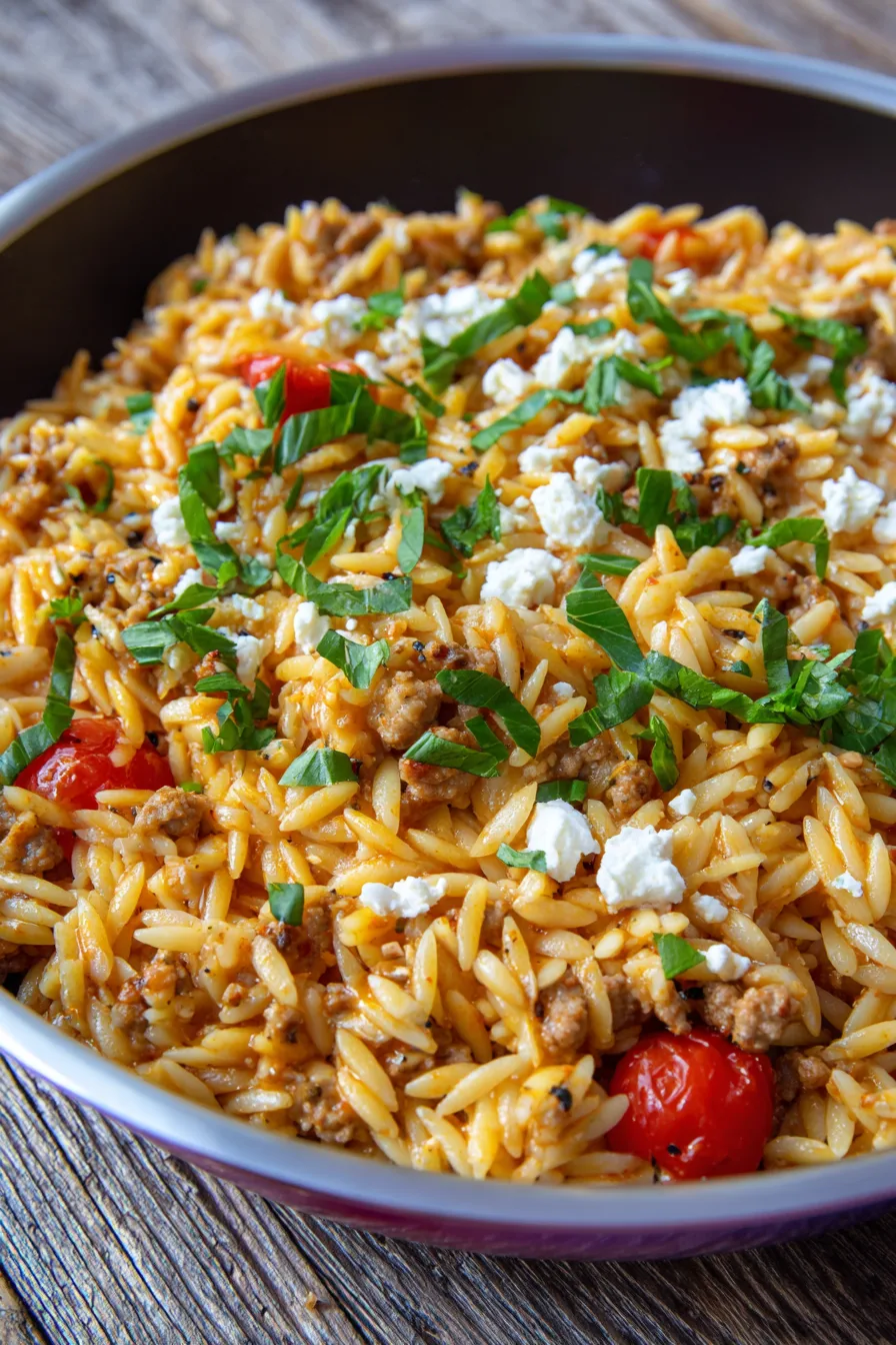 Transform this already nutritious dish into an even healthier powerhouse with strategic substitutions. Replace regular orzo with whole wheat or legume-based versions for 40% more fiber and protein. Ground turkey breast (99% lean) reduces fat content further while maintaining protein levels. Substitute half the orzo with cauliflower rice for a lower-carb version that cuts calories by 25%. Add spinach or kale during the final minutes for extra iron and vitamins. Use nutritional yeast instead of feta cheese for a dairy-free, B12-rich alternative that provides similar umami depth.