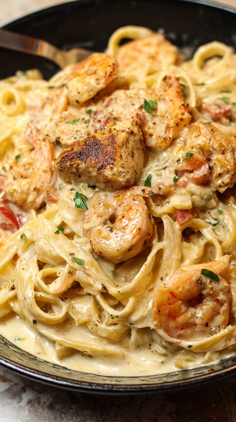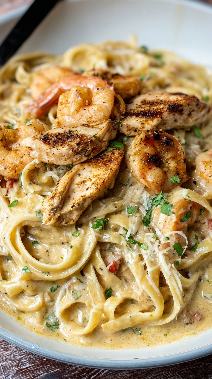 Return cooked chicken and shrimp to the skillet, along with drained pasta. Toss everything together for 2-3 minutes, allowing the pasta to absorb some sauce. Finish with fresh parsley and additional Parmesan if desired.