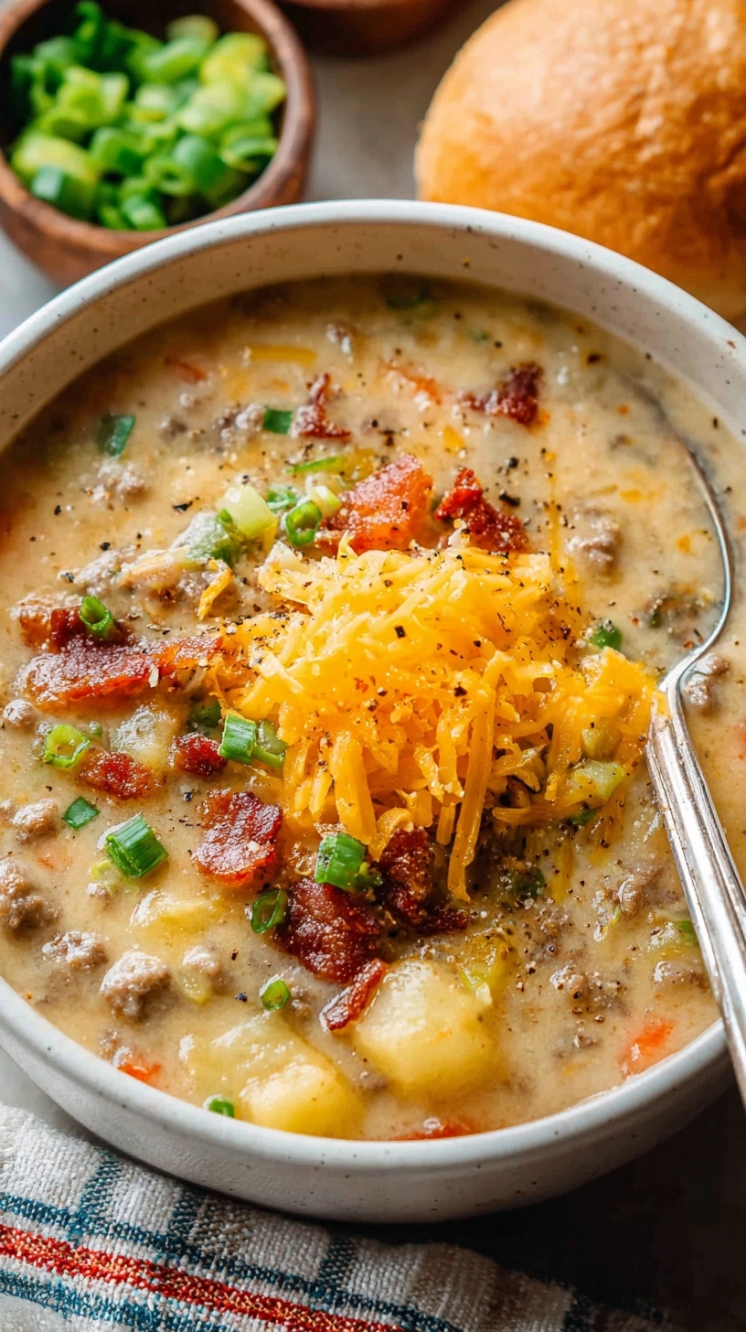 Serve this hearty cheeseburger soup in warmed bowls topped with crispy bacon bits, fresh chives, and a dollop of sour cream. Pair with toasted brioche buns, garlic bread, or classic dinner rolls for the complete burger experience. For entertaining, set up a toppings bar with diced pickles, shredded lettuce, and extra cheese—guests can customize their bowls just like building their perfect burger.