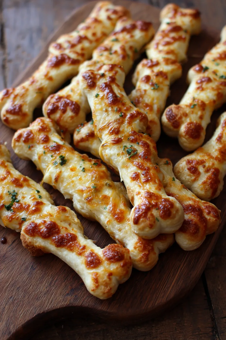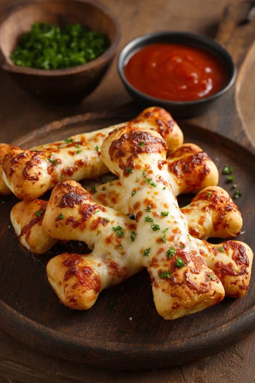 Present your Cheesy Halloween Breadstick Bones on a black serving platter surrounded by dry ice (safely contained) for an authentically spooky effect. Pair with marinara sauce tinted with a drop of black food coloring for “blood” dipping, or serve alongside a creamy garlic aioli.