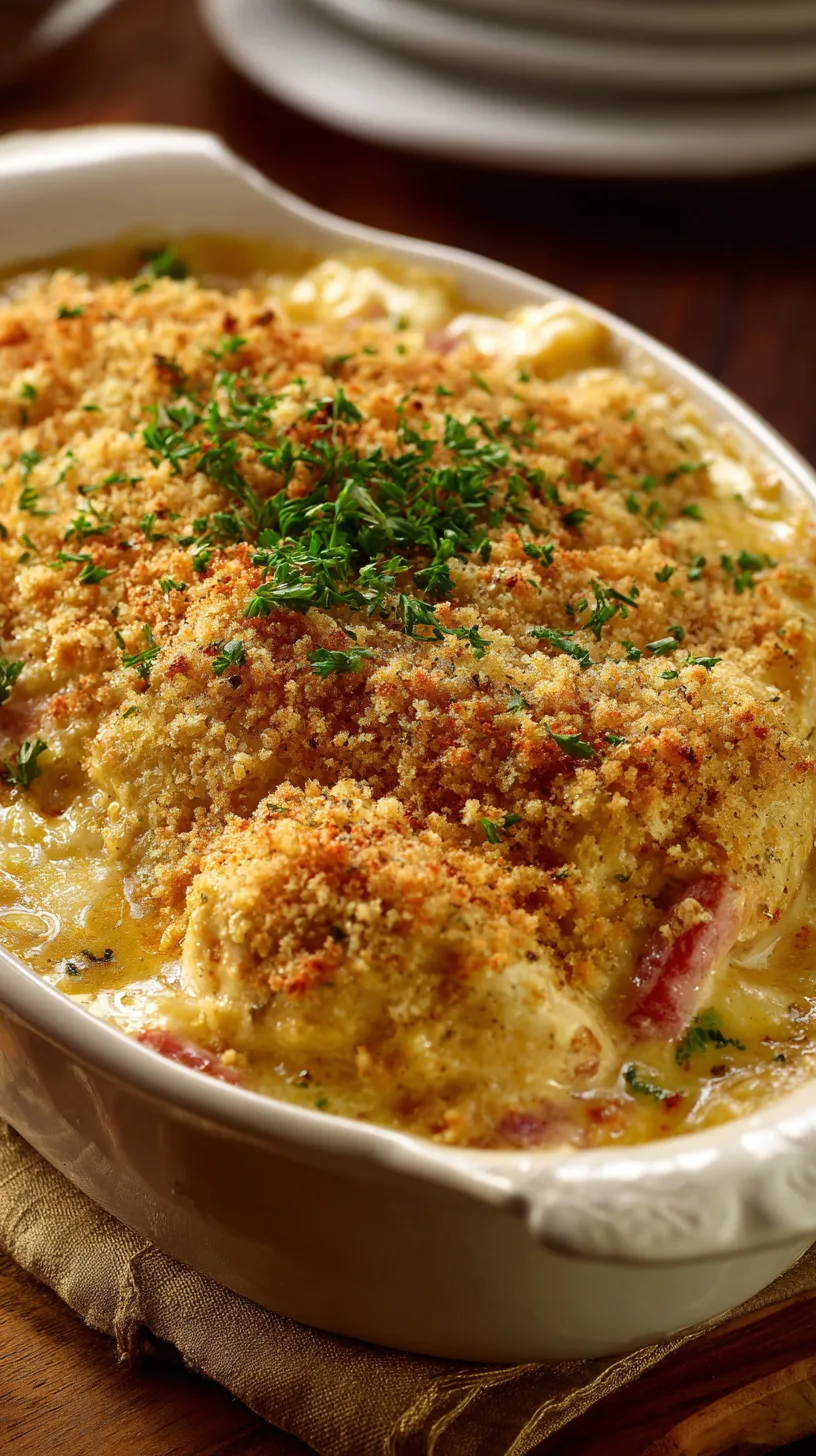 Mix melted butter with panko breadcrumbs and onion soup mix. Sprinkle this mixture over the top for that signature crispy texture that mimics traditional cordon bleu's exterior.