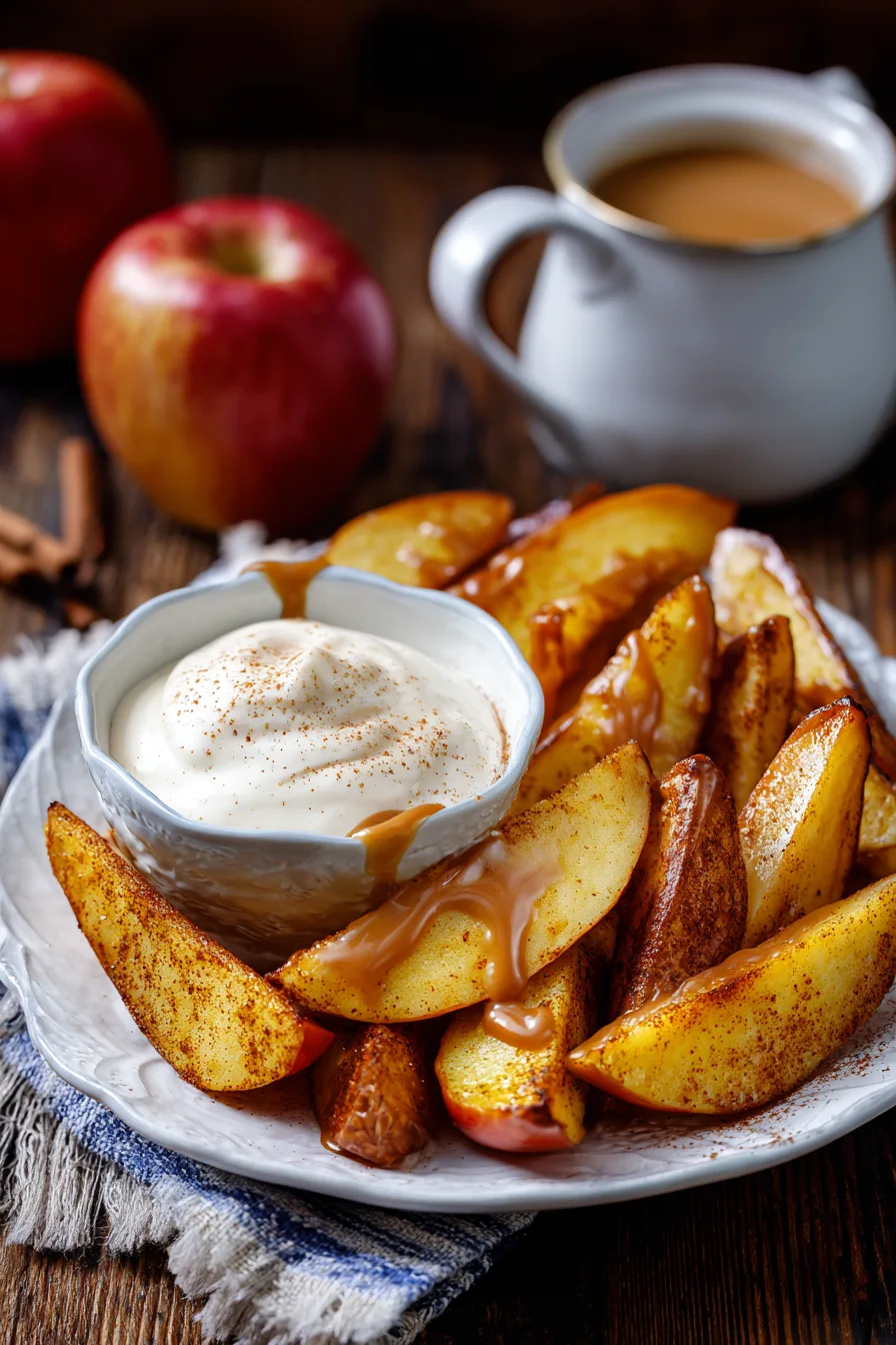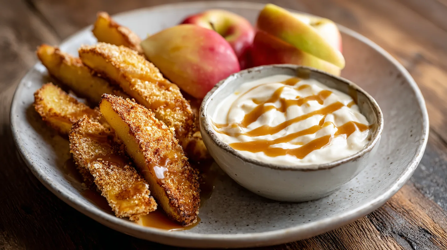 Crispy Air Fried Apple Wedges with Caramel Whipped Cream Dipping Sauce