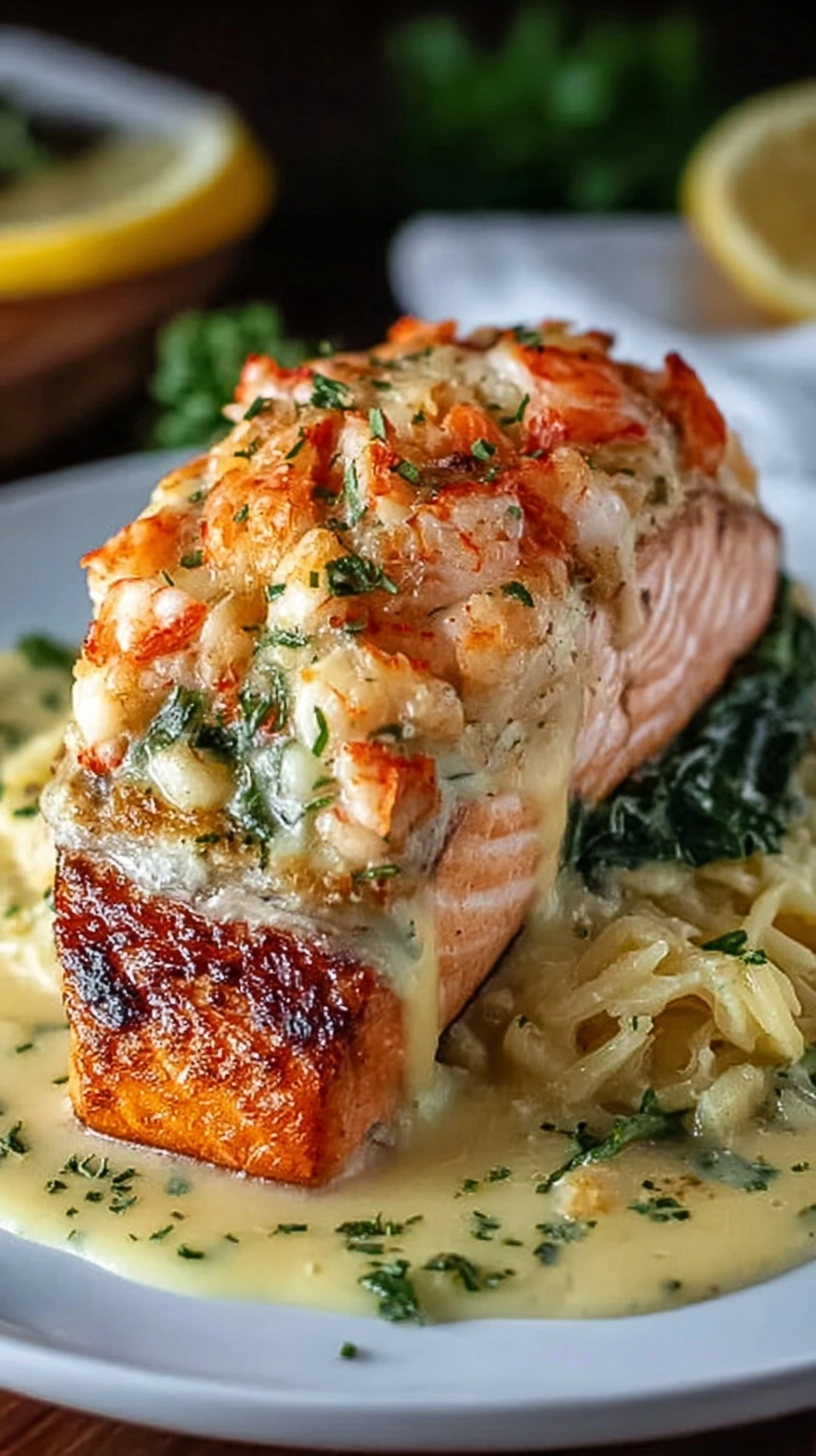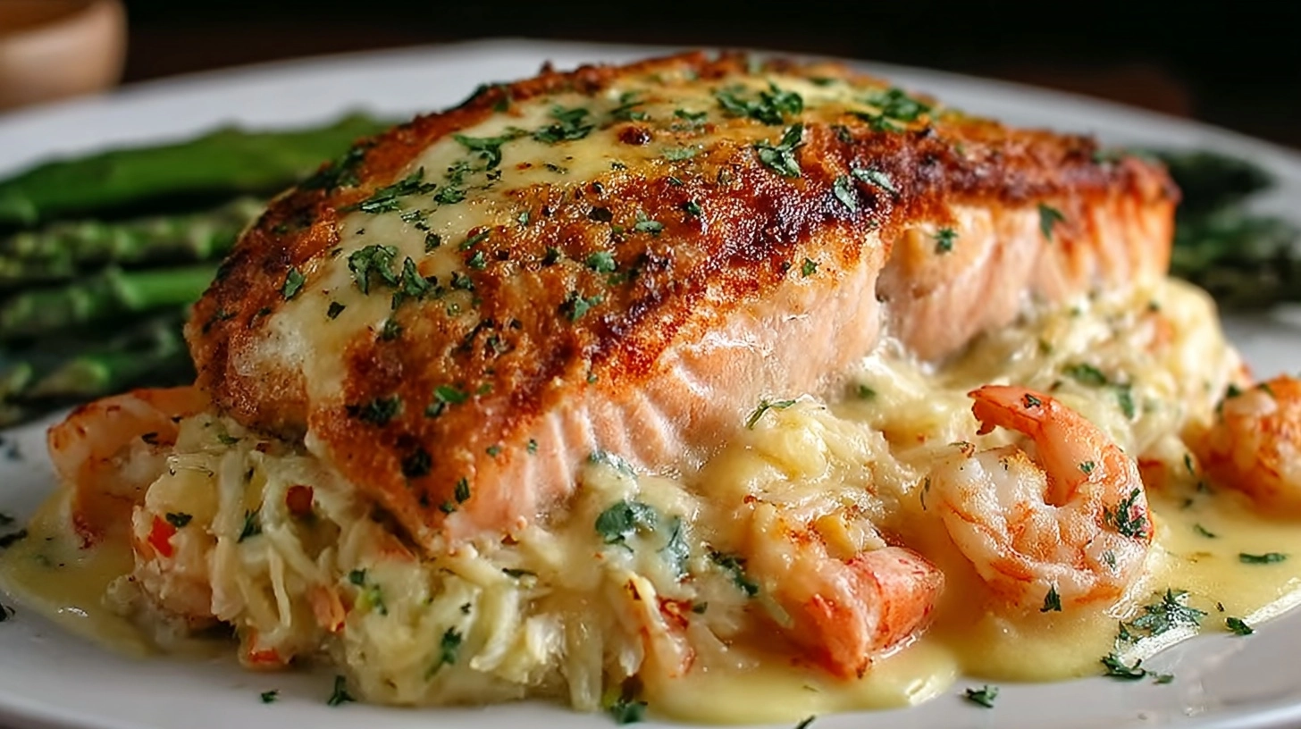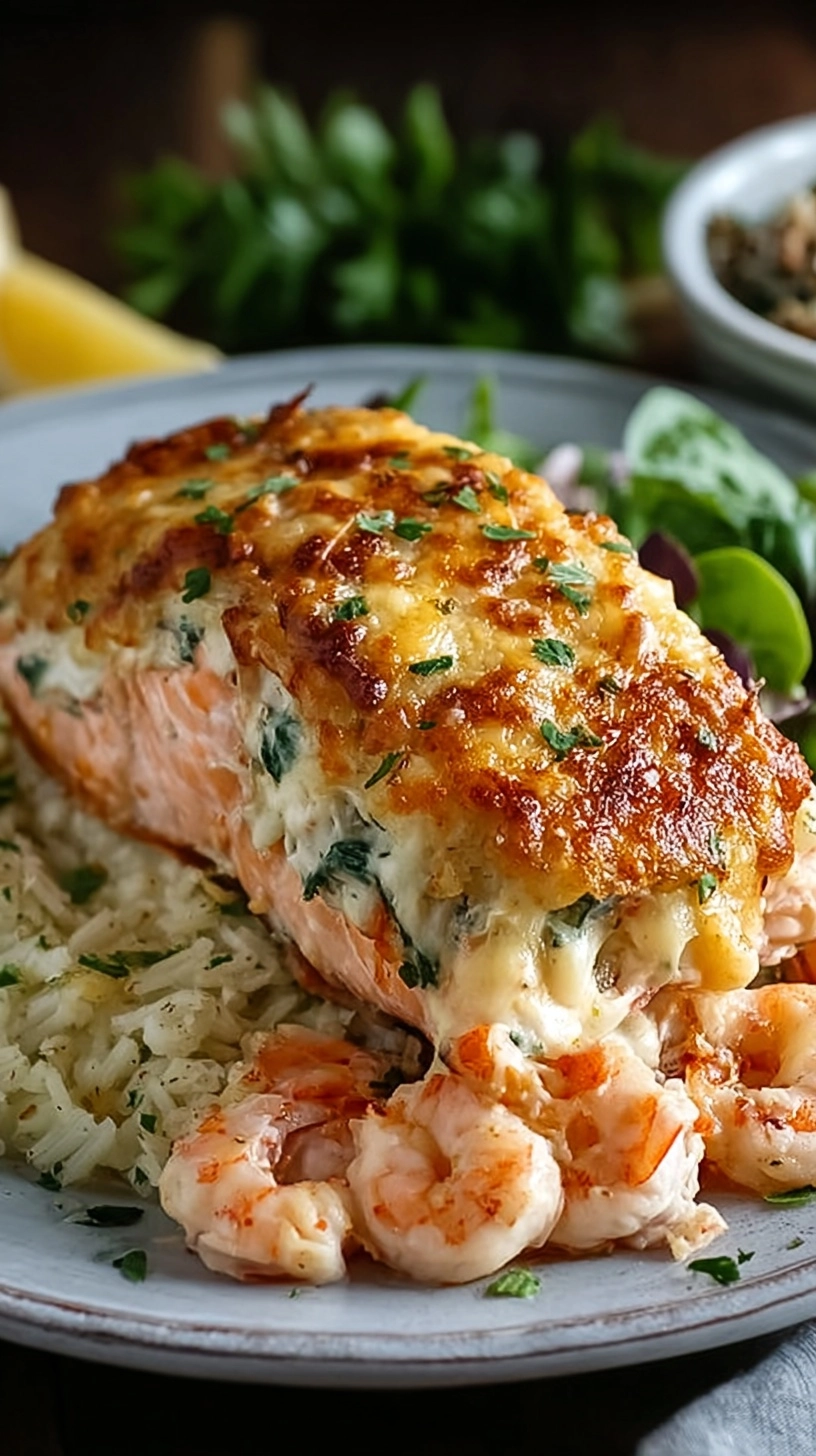 Elevate your Deliciously Decadent Crab and Shrimp Stuffed Salmon presentation with roasted asparagus drizzled in lemon butter, creating a colorful contrast that complements the seafood flavors. Pair with garlic herb quinoa or wild rice pilaf for sophisticated texture variation. A simple arugula salad with citrus vinaigrette cuts through the richness while adding fresh, peppery notes. For special occasions, serve alongside roasted fingerling potatoes with fresh herbs.