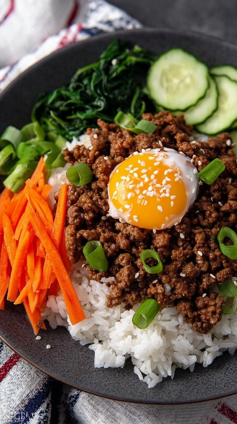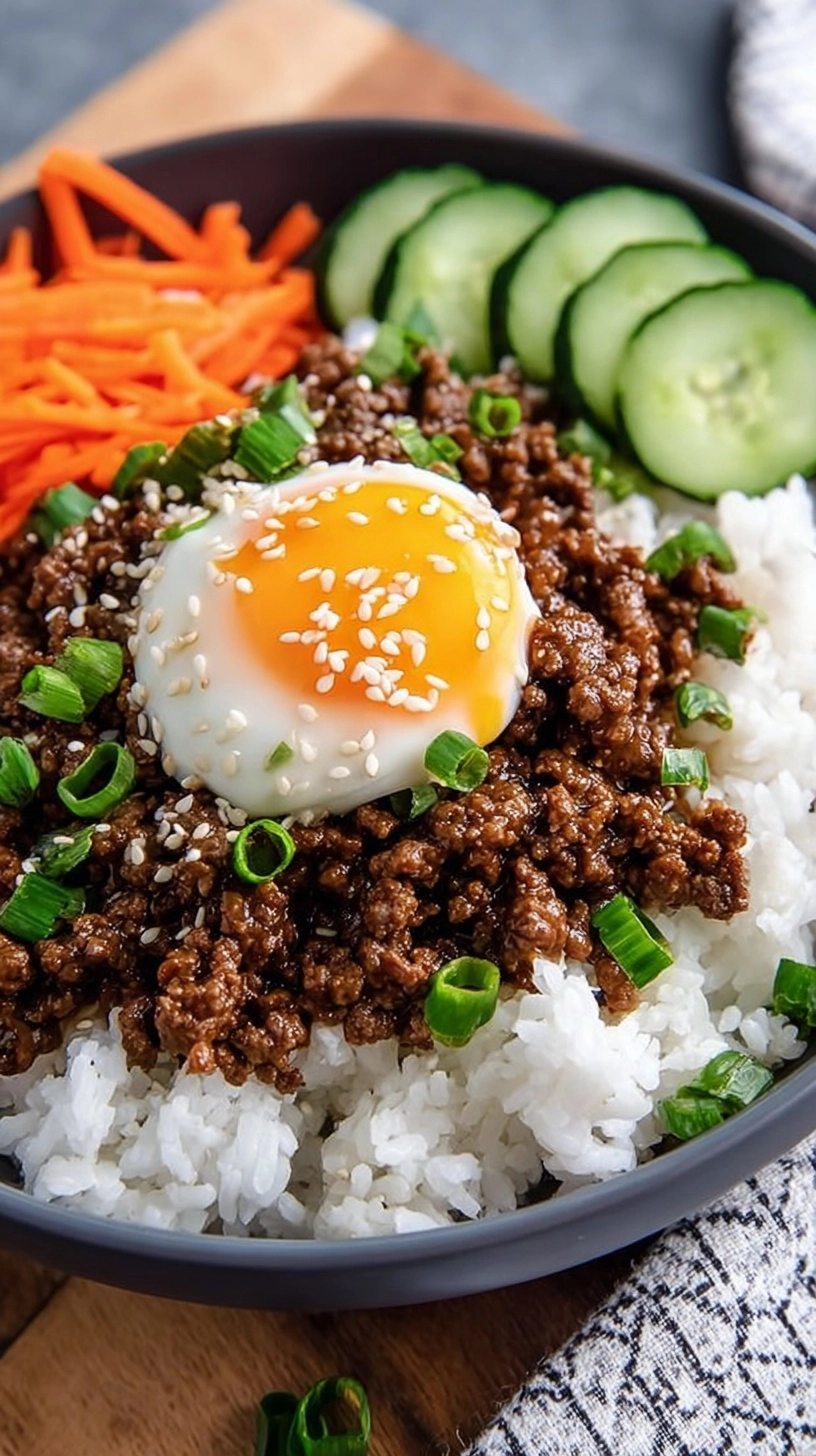 Divide the cooked rice among four serving bowls. Top each bowl with the Korean ground beef mixture, then arrange the fresh cucumber slices and julienned carrots alongside. Sprinkle with chopped green onions and sesame seeds for the finishing touch.