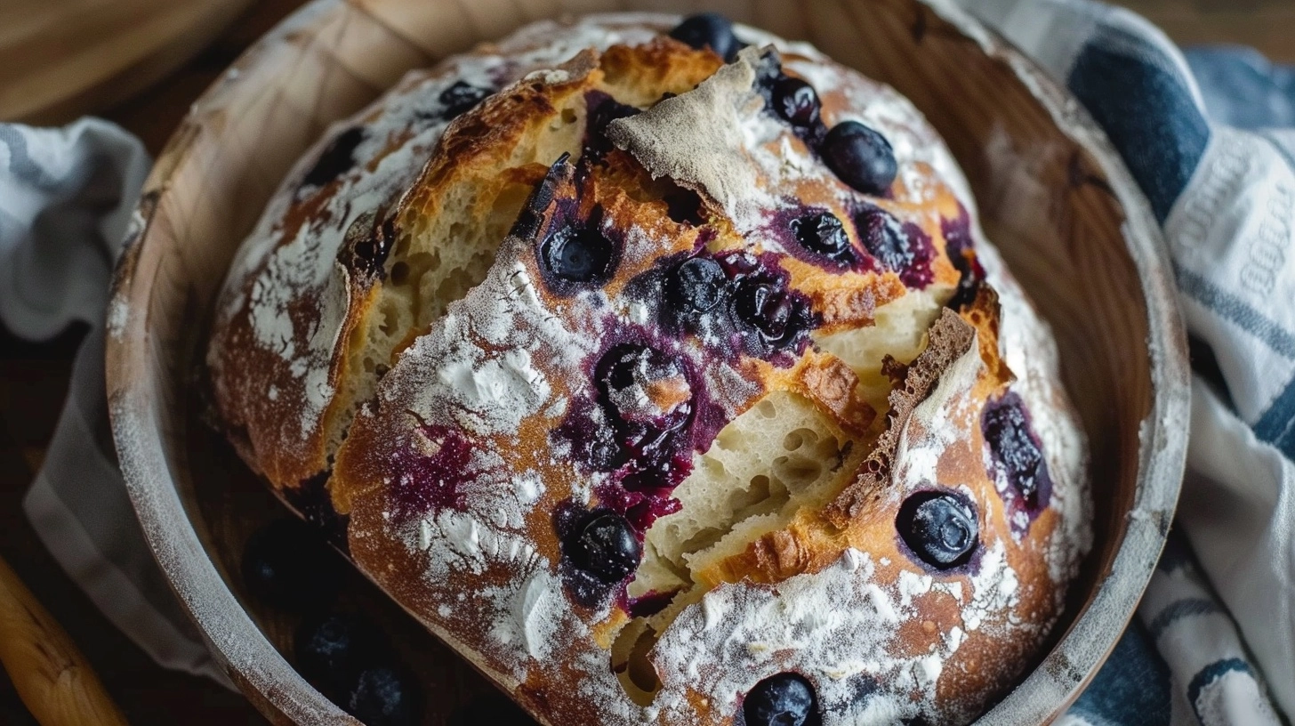 This sourdough provides 15% more protein than conventional sweet breads due to the fermentation process, which breaks down proteins into more digestible amino acids. The blueberries contribute anthocyanins and vitamin C, while the fermentation process reduces gluten content by approximately 25%.
