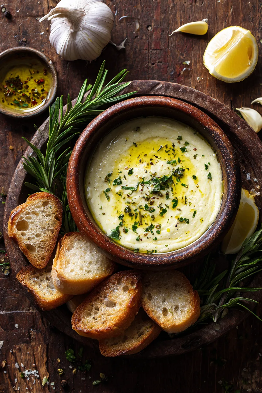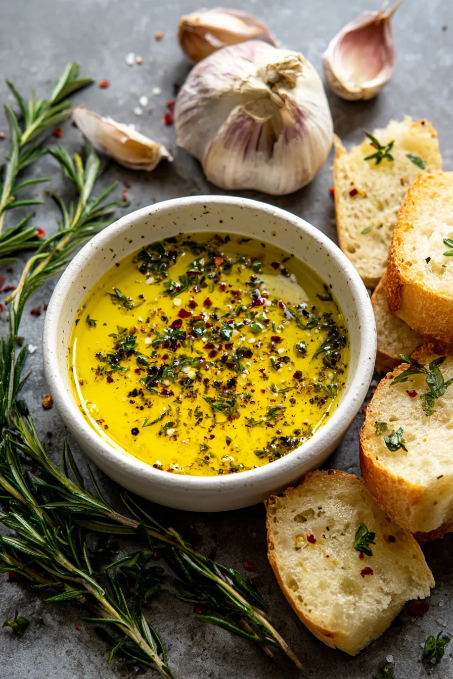 Transform your kitchen into a Mediterranean oasis with these carefully selected ingredients for your garlic olive oil dip: