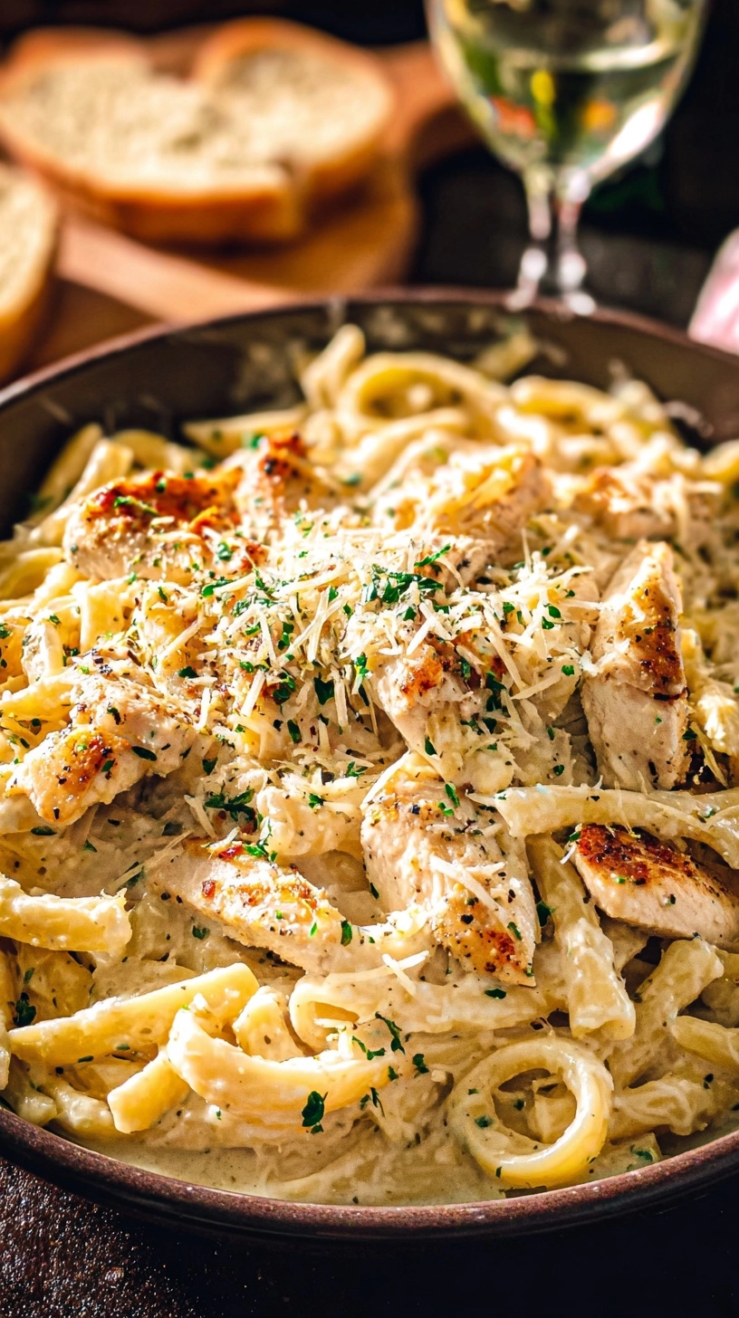 Transform this Garlic Parmesan Chicken Pasta into a complete dining experience by pairing with a crisp Caesar salad and warm, crusty garlic bread. For elegant entertaining, serve in individual pasta bowls with freshly grated Parmesan and a sprinkle of toasted pine nuts. Consider offering lemon wedges on the side – a squeeze of citrus brightens the rich cream sauce beautifully. For family-style comfort, present in a large serving bowl with extra cheese and red pepper flakes for customization.
