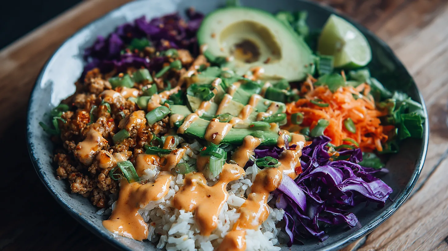 Each serving of these Ground Turkey Rice Bowls with Bang Bang Sauce provides approximately 485 calories, 28g of high-quality protein, 52g of carbohydrates, and 18g of healthy fats. The lean ground turkey delivers all essential amino acids while remaining lower in saturated fat compared to ground beef. Greek yogurt in the sauce contributes probiotics and additional protein, while the colorful vegetables provide fiber, vitamins A and C, and antioxidants. This balanced macronutrient profile supports muscle maintenance, sustained energy levels, and overall wellness goals.