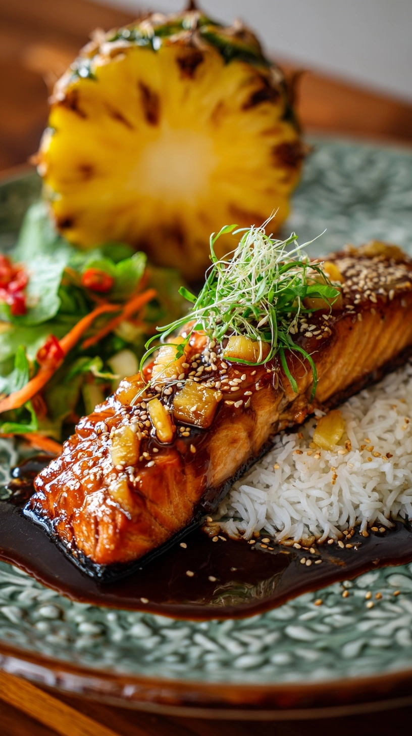 Serve your pineapple glazed salmon over fluffy jasmine rice or quinoa pilaf to absorb the extra glaze. Pair with roasted asparagus or steamed broccoli for a complete nutritional profile. For entertaining, present on individual plates garnished with fresh pineapple chunks, sliced green onions, and toasted sesame seeds. Consider serving alongside coconut rice or cauliflower rice for varied dietary preferences. A simple mixed greens salad with citrus vinaigrette complements the tropical flavors beautifully.