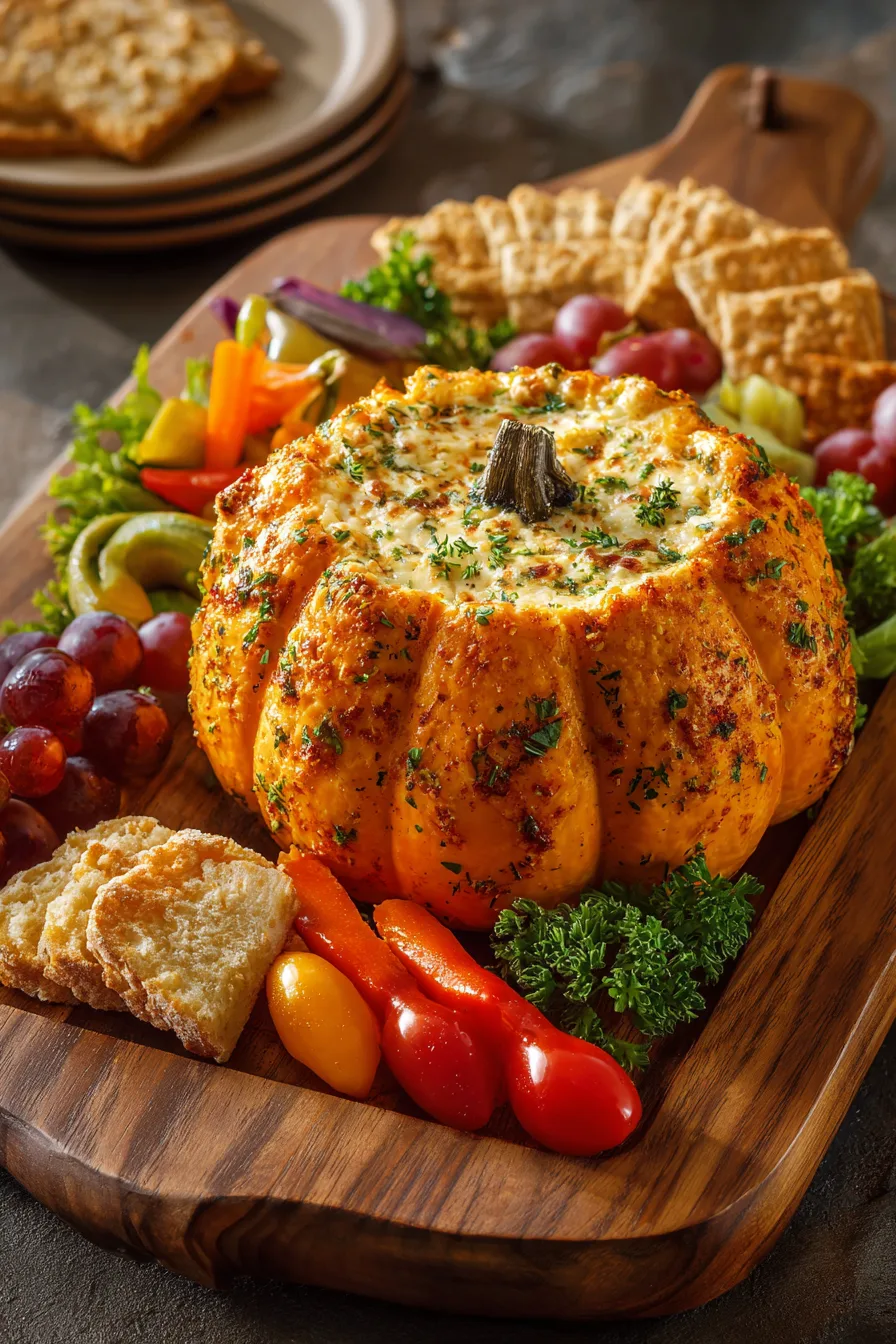Present your pumpkin-shaped cheese ball as the centerpiece of an autumn-themed appetizer spread. Surround it with orange and brown crackers, sliced baguette rounds, and colorful vegetables like orange bell pepper strips and baby carrots to maintain the harvest theme.