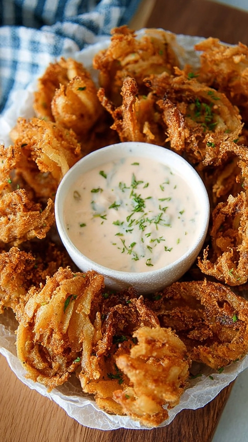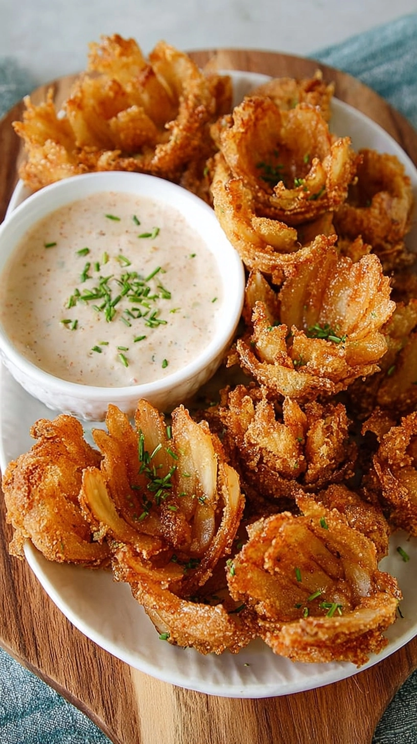 Present your Bite-Sized Blooming Onions + Buttermilk Ranch Dip on a rustic wooden board with colorful vegetable crudités for visual appeal. Pair with crispy sweet potato fries or air-fried zucchini chips for a complete appetizer spread. These mini delights complement grilled proteins perfectly, making them ideal for barbecue gatherings or casual dinner parties.