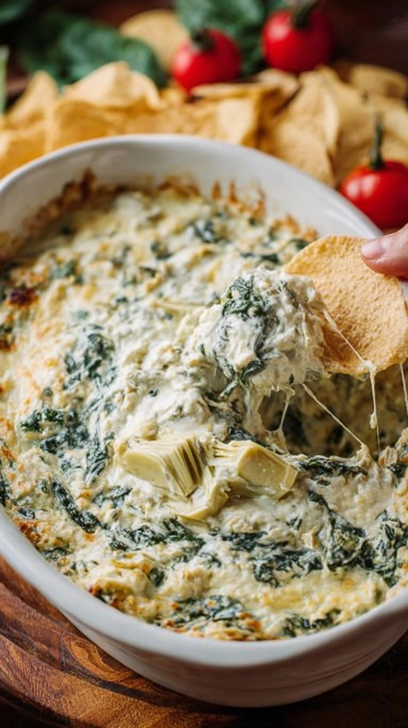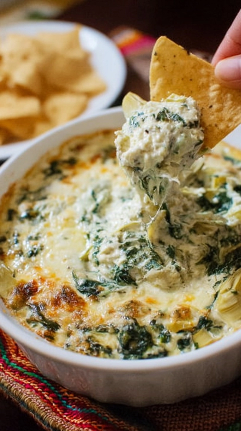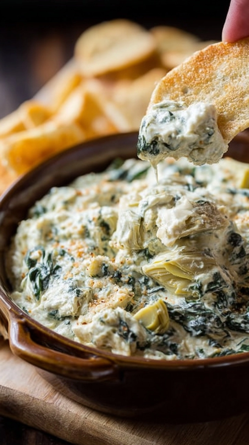 Present your spinach artichoke dip in a cast-iron skillet for rustic charm, or use a colorful ceramic dish that maintains temperature beautifully. Surround your dip with an array of dippers: toasted baguette slices, pita chips, tortilla chips, and fresh vegetables like bell pepper strips, cucumber rounds, and cherry tomatoes.
