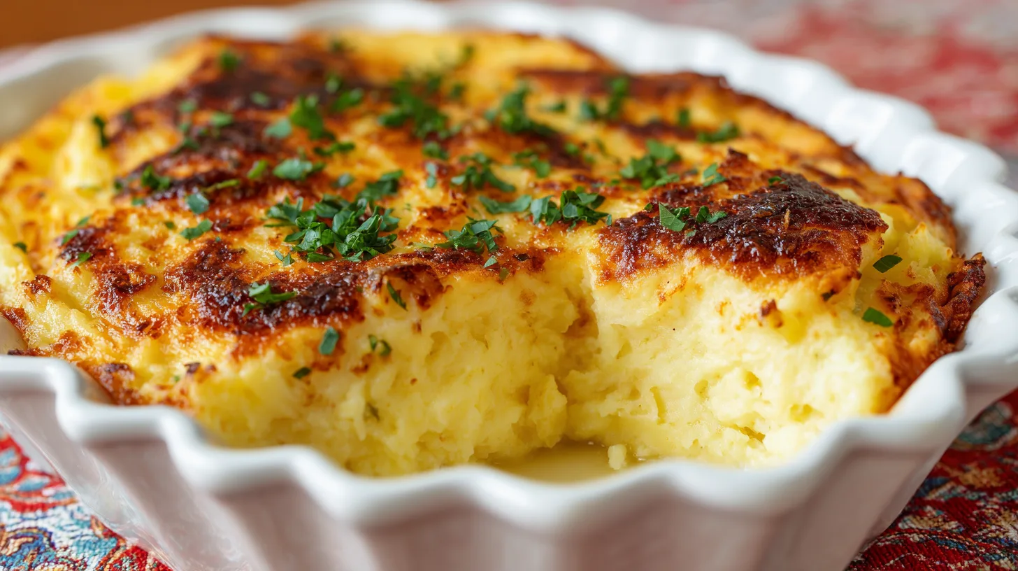 Add softened cream cheese to warm potatoes and mash until completely smooth. Gradually incorporate the warm cream mixture, beaten eggs, garlic powder, salt, and white pepper. The cream cheese acts as a stabilizer, preventing separation during baking while adding luxurious richness.