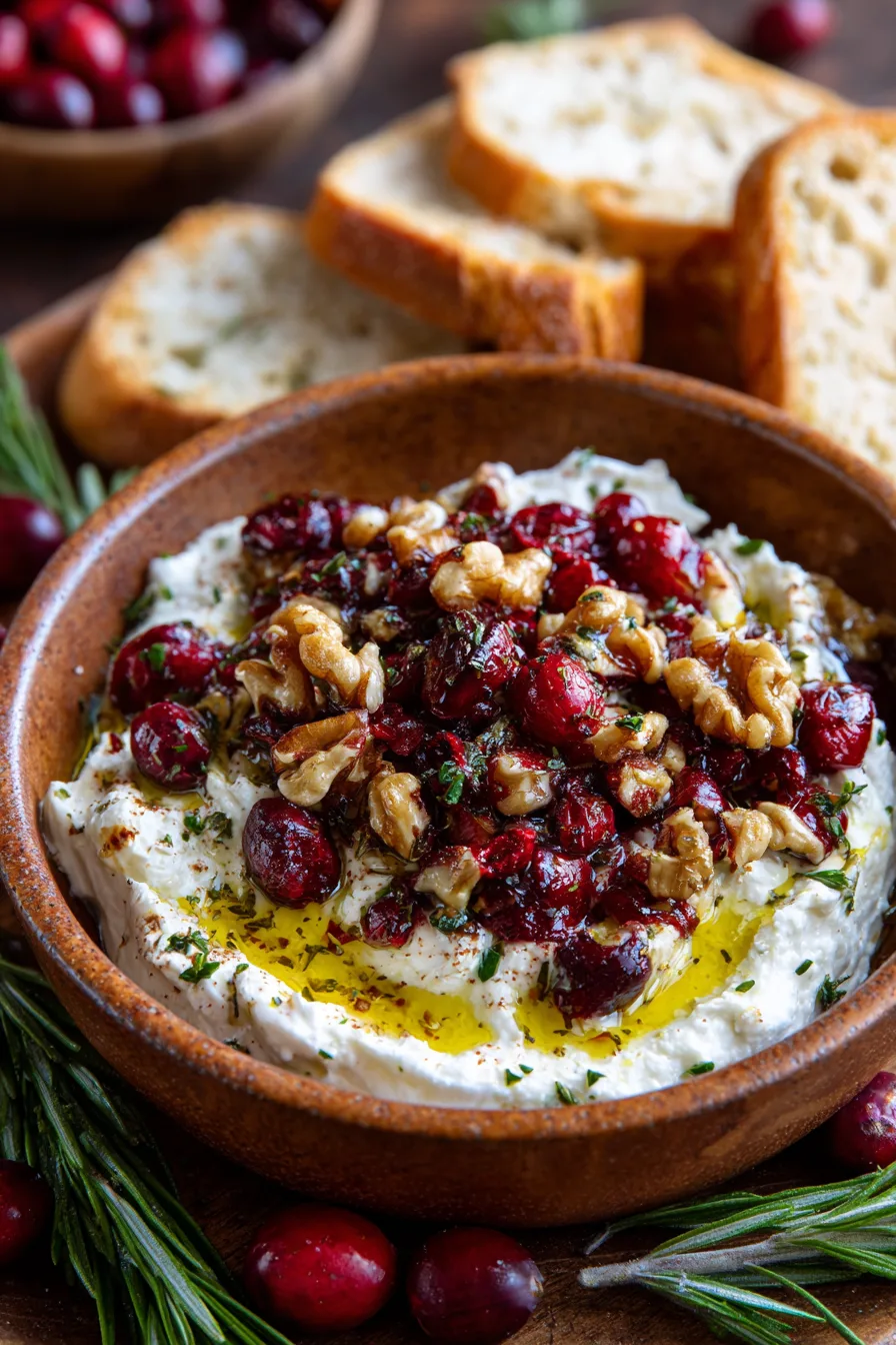 Transfer the whipped feta with cranberries and walnuts mixture to your serving bowl or platter. Create gentle swirls with the back of a spoon, then artfully distribute cranberries and toasted walnuts across the surface. Drizzle with honey and finish with fresh thyme leaves and cracked black pepper.